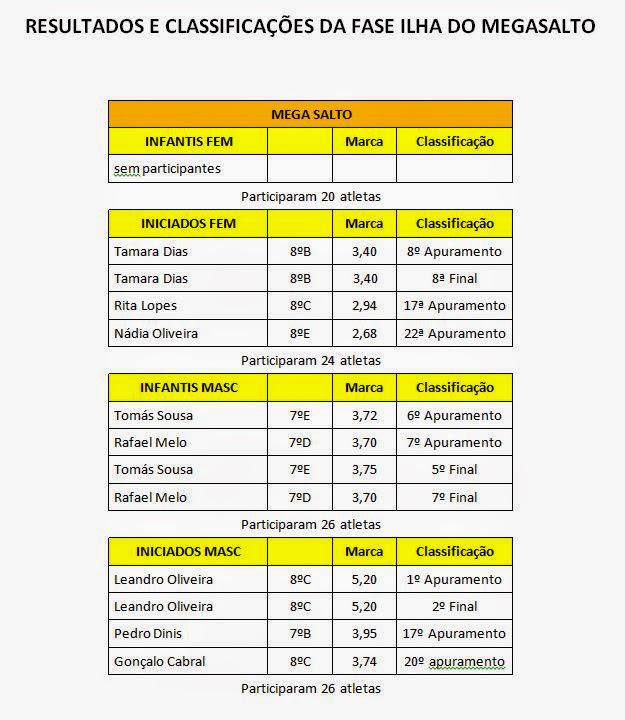 Foi muito positiva a participação da nossa comitiva na fase ilha do MegaSalto e do MegaSprinter, registando-se excelentes classificações de alguns alunos nas finais. Seguem-se os quadros resume da nossa participação nas duas competições que decorreram na pista de atletismo do Complexo Desportivo das Laranjeiras, no passado dia 11 de fevereiro.
